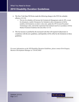 The document summarizes New York State Workers' Compensation Law reforms from 2007 that introduced limitations on how long non-schedule permanent partial disability claims can receive benefits. It discusses guidelines developed by a task force for determining disability duration, including medical impairment, residual functional abilities, and loss of wage-earning capacity. The medical impairment and residual functional abilities guidelines were completed, but not the loss of wage-earning capacity guidelines. The document also notes changes made to the medical fee schedule to increase evaluation and management codes by 30% and offset limitations in the new medical treatment guidelines.