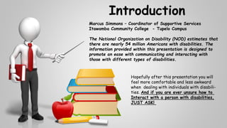 The document provides guidelines for interacting respectfully and appropriately with individuals with various disabilities, emphasizing the importance of understanding their unique needs and preferences. Key advice includes not touching mobility devices, effectively communicating with those who are deaf or blind, and being mindful of the personal space and dignity of individuals with disabilities. It encourages awareness of specific challenges faced by individuals with conditions like cerebral palsy, autism, or brain injuries and suggests consulting support services for additional assistance.
