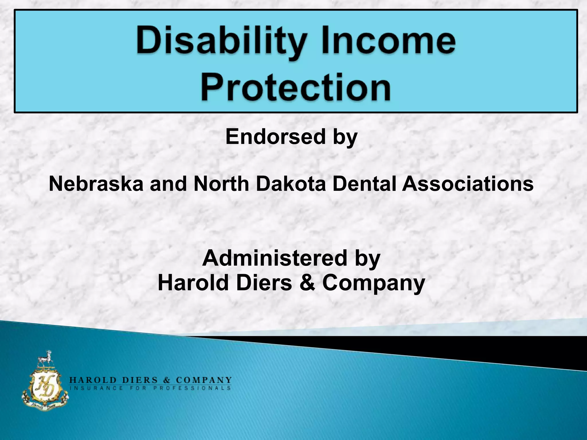 The document outlines a long-term disability insurance plan endorsed by the Nebraska and North Dakota dental associations, emphasizing the need to protect one's income-producing capability. It details various benefits, including total and residual disability coverage, waiver of premium, and additional benefits for specific circumstances, aimed at providing financial support to dentists in case of disability. Harold Diers & Co., Inc. is the administrator of the plan, offering services since 1941.