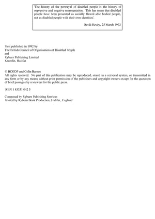 This document provides an overview of commonly used negative stereotypes of disabled people in media such as television, film, newspapers and advertising. It notes that these stereotypes are harmful as they portray disability as something pitiable or shameful rather than a normal variation in human life. The document aims to establish principles for more accurate and respectful media representations of disabled people by eliminating stereotypes. It also provides information on complaint procedures for different media.