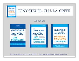 The document is a comprehensive workbook on disability insurance authored by Tony Steuer, aimed at educating readers about the importance of income protection against disabilities. It covers various aspects including the need for disability income insurance, types of coverage, evaluating needs, choosing an advisor, and maintaining insurance policies. Key statistics and actionable advice are provided to help individuals plan financially for potential disabilities.
