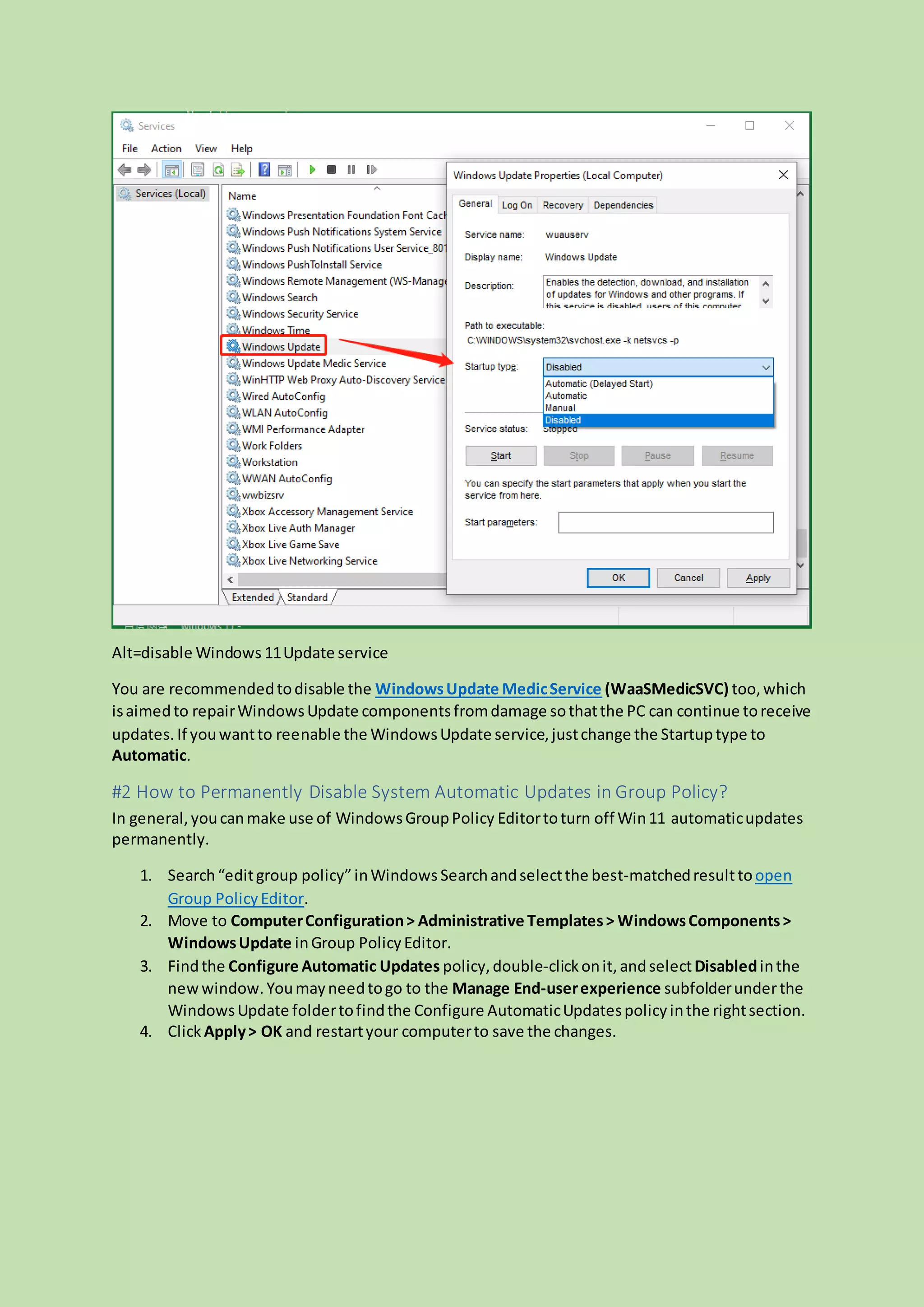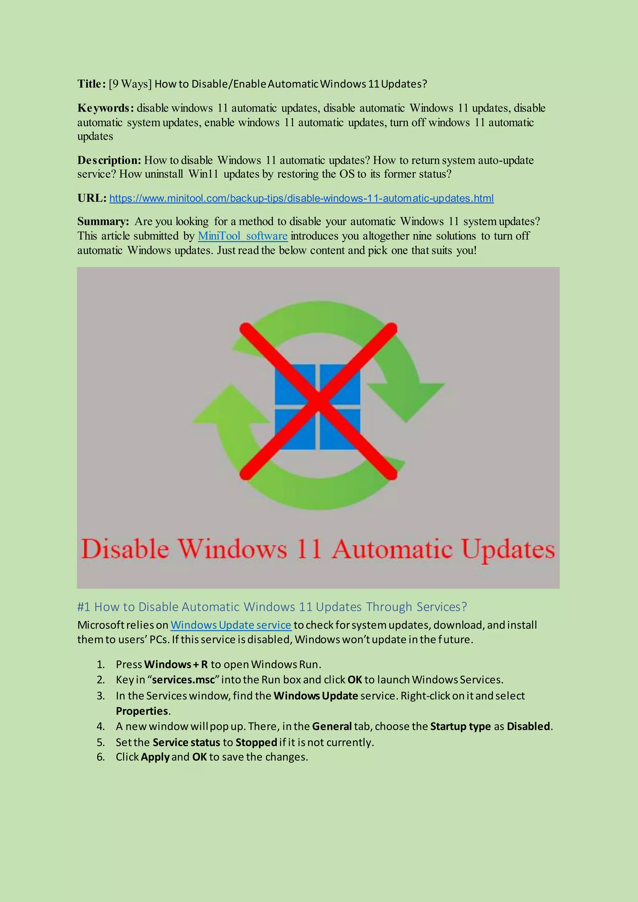 The document provides nine methods for disabling or enabling automatic Windows 11 updates, including using services, group policy, task scheduler, and the registry. It also discusses pausing updates and options for using third-party tools or system restoration to revert updates. The article cautions against permanently disabling updates, as these contain important features and security patches.
