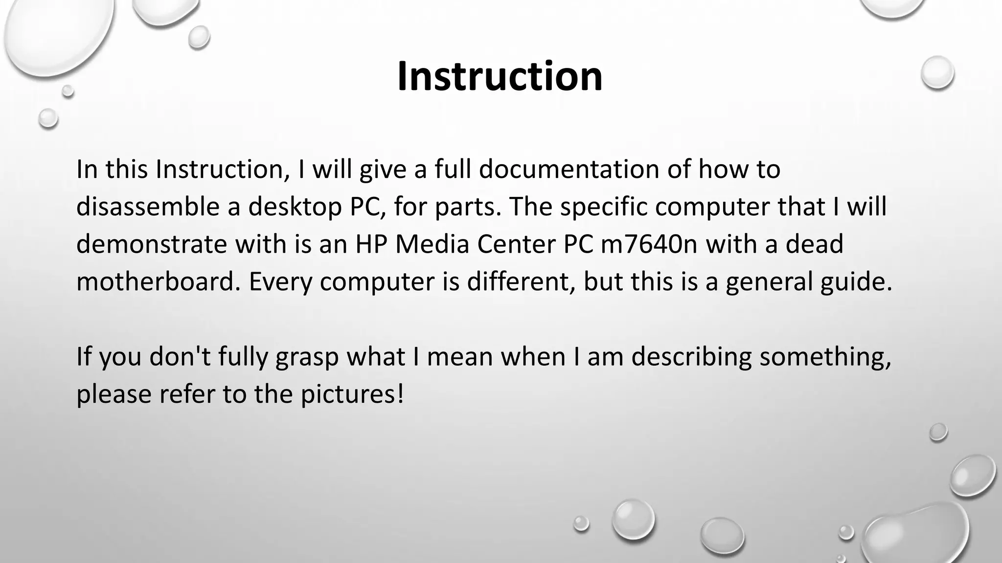 This document provides a step-by-step guide on how to disassemble a desktop PC, specifically an HP Media Center PC m7640n with a dead motherboard. It outlines the necessary tools, safety precautions, and detailed instructions for removing various components, including the outer casing, system fan, and CPU fan. The guide emphasizes the importance of properly unplugging the computer and handling components safely to avoid damage.