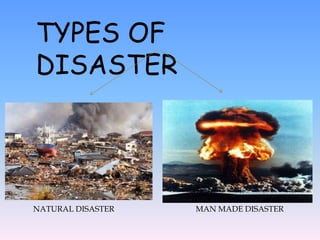 A disaster is defined as a sudden event that exceeds a community's ability to cope using its own resources. Disasters can be natural or human-caused. Natural disasters include hazards like earthquakes, floods, droughts and cyclones that kill thousands and cause billions in damage annually. Human-caused or manmade disasters result from technological hazards, wars, and deliberate attacks. Developing countries are often more vulnerable to natural disasters due to factors like population growth, deforestation, and lack of disaster prevention planning. Effective disaster management includes preparedness, mitigation, response and recovery efforts to minimize risks and impacts and return communities to normalcy.