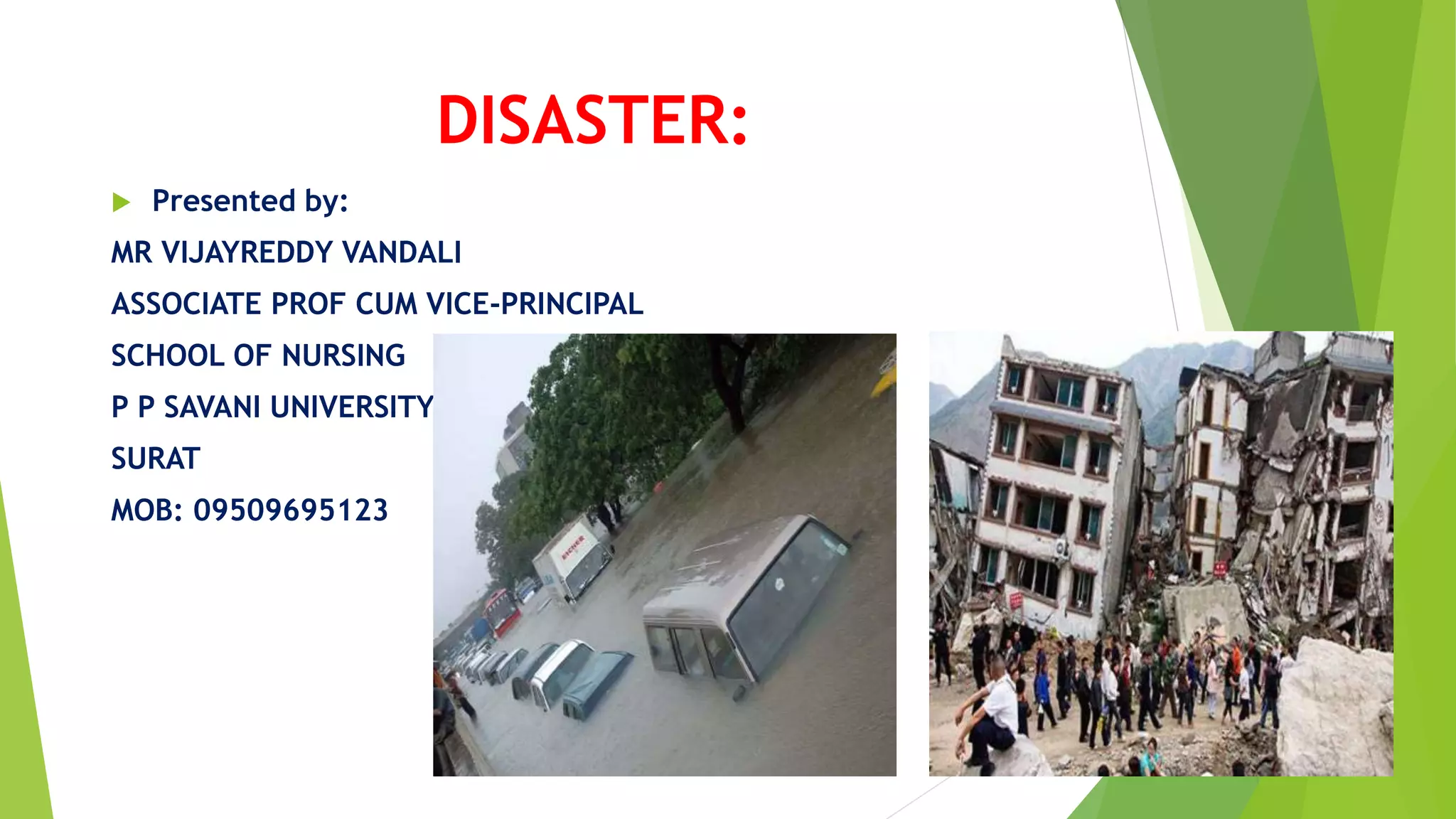 Disasters can be natural or human-made events that cause widespread damage and loss of life. Natural disasters include floods, earthquakes, hurricanes, and wildfires. Human-made disasters are caused by events like industrial accidents, transport accidents, and terrorism. When a disaster occurs, it is important to conduct search and rescue operations, provide first aid and medical treatment, and prevent disease outbreaks. The long-term goals are rehabilitation and rebuilding infrastructure to restore normal living conditions. Proper disaster management requires being prepared through risk assessment, planning response and recovery, and mitigating impacts.