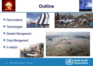 The document presents an overview of disaster and crisis management, focusing on definitions, management strategies, and comparisons between significant earthquakes in Haiti and Chile. It details the importance of preparedness and response strategies, along with the crisis life cycle and risk management approaches. Additionally, the discussion includes disaster management activities such as mitigation, preparedness, response, and recovery.