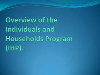 The document is a guide by FEMA for individuals and households affected by disasters, outlining the Individuals and Households Program (IHP) which provides financial assistance and services for essential needs not covered by insurance. It specifies eligibility requirements and types of assistance available, including temporary housing, home repair, and replacement funds. The guide emphasizes that IHP does not cover all losses or restore properties to their pre-disaster condition.