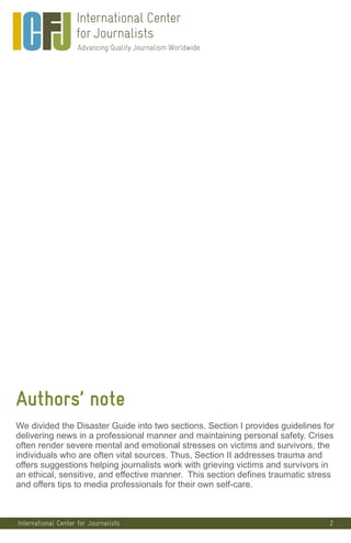 This document provides an introduction and overview for a guide on disaster and crisis coverage for journalists. It summarizes key points about preparing newsrooms and journalists for disaster coverage.