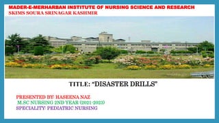 This document discusses disaster drills, which are simulations of emergency situations conducted to educate personnel and test emergency response plans. It defines disaster drills and describes three common types: tabletop drills, functional drills, and full-scale drills. Key aspects of designing effective disaster drills are outlined, including defining objectives, crafting scenarios, and planning activities. Guidelines are provided for roles in drills, such as incident commanders and evaluators. The document emphasizes that regular drills are important to identify weaknesses in plans and increase staff confidence and coordination in responding to emergencies.