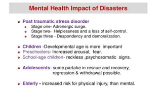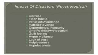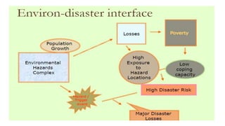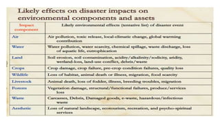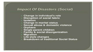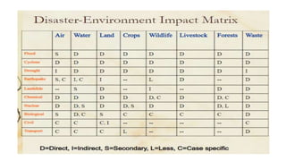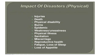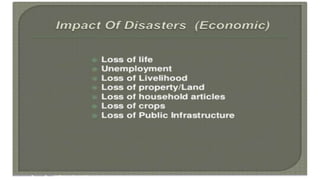 The document discusses disasters and their impacts. It defines a disaster as a sudden event that disrupts normal life and exceeds available resources. Disasters can be natural or man-made. The impacts of disasters include physical damage and injury as well as social and economic disruption. A disaster impact assessment evaluates development projects to identify risks and ways to reduce damages from potential disasters. It considers natural hazards like floods as well as technological hazards caused by infrastructure failures. The assessment aims to incorporate appropriate countermeasures into project design, construction, and management.