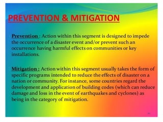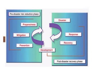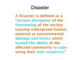 The document discusses disasters caused by natural hazards such as earthquakes and tsunamis. It provides details about the 2011 earthquake and tsunami in Japan, including that an earthquake of magnitude 9 struck off the coast, generating a devastating tsunami. This caused widespread damage and led to a nuclear emergency at the Fukushima power plant. The document also outlines different types of natural disasters and provides information on tsunami formation, preparedness, and response.