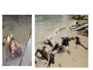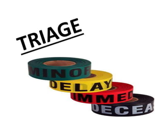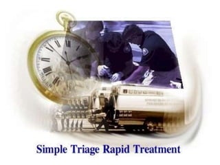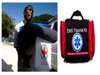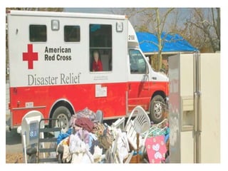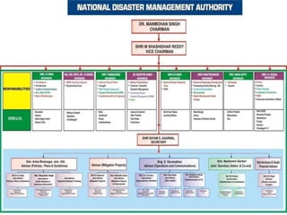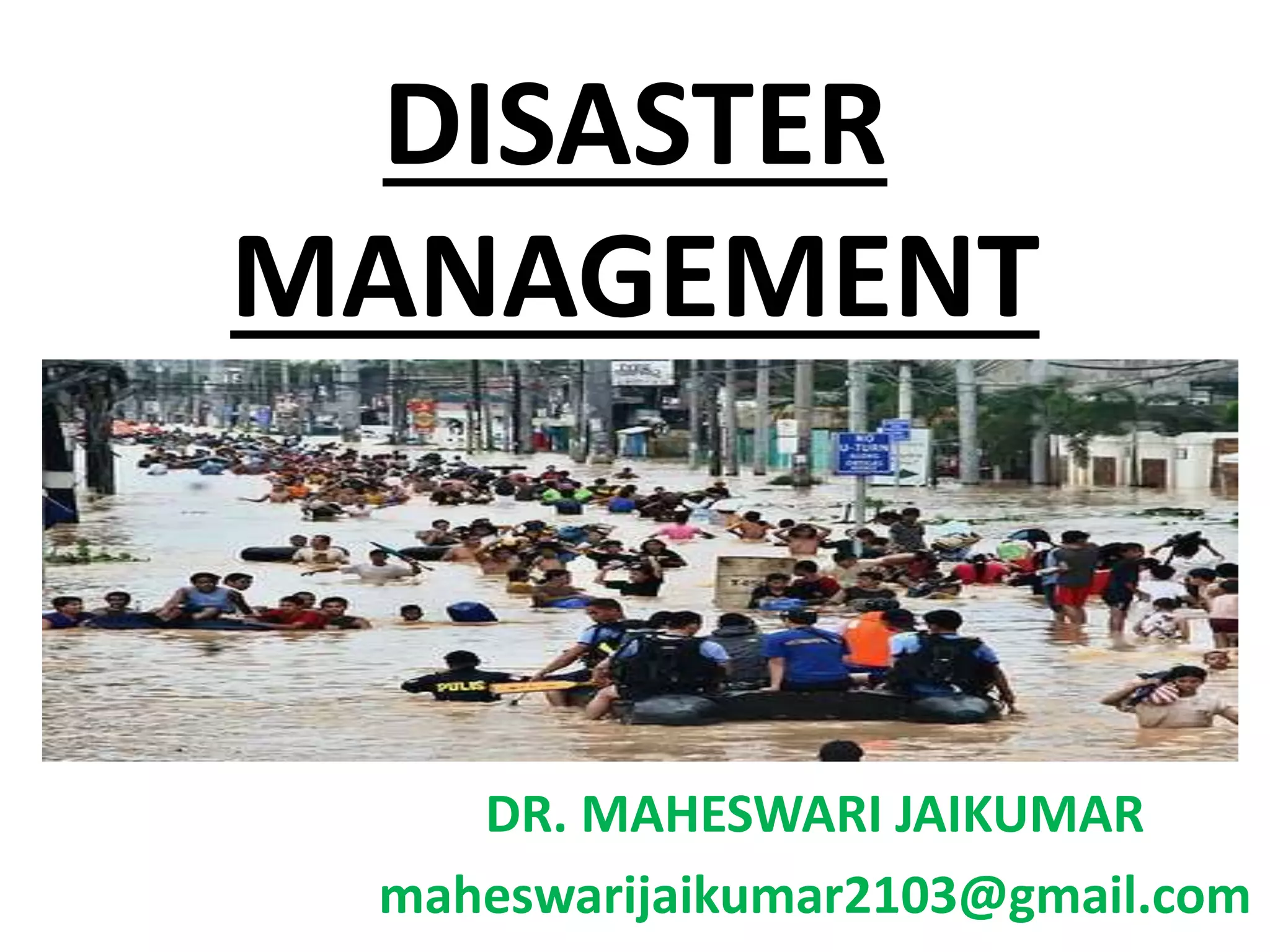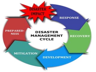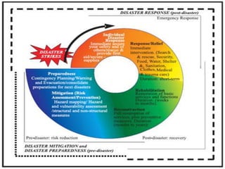 This document discusses disaster management and is divided into several sections. It defines disasters and hazards, and classifies disasters into 5 categories including water/climate, geological, chemical/industrial, accident, and biological disasters. It describes the disaster cycle and impact/response phase, which involves search and rescue, triage, tagging victims, and caring for the dead. The relief phase focuses on disease control, nutrition, vaccination, and rehabilitation. Other sections cover the recovery, preparedness, and planning phases of disaster management.