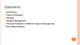 The document covers disaster management, defining disasters and hazards, and detailing types of natural and human-induced disasters prevalent in India. It discusses strategies for disaster preparedness, response, and mitigation, emphasizing the importance of community involvement and readiness in different emergency situations. Additionally, it outlines necessary personal protection measures and the impact of disasters on health and infrastructure.