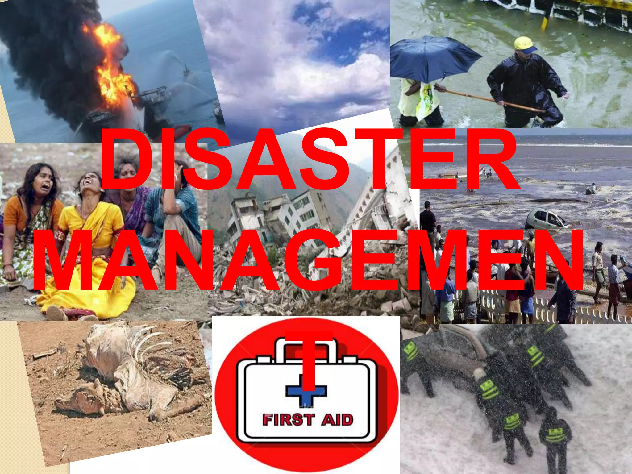 Disaster management involves preparedness, response, recovery and mitigation of natural and man-made disasters. It aims to reduce human suffering during disasters through organized efforts. Disaster management has several phases including pre-impact preparation, emergency response during impact, and post-impact recovery. Nurses play an important role in disaster management by assisting communities before, during and after disasters through activities like preparedness drills, disease surveillance, psychological support, and health education.