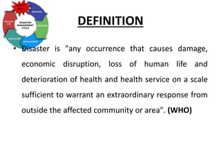 The document presents a comprehensive overview of disaster management, defining disasters, classifying them into natural and man-made types, and outlining principles of disaster management. Key components include preparedness, response, recovery, and the role of healthcare professionals in triage and community support during and after disasters. It also emphasizes the importance of hospital disaster plans and community involvement in disaster preparedness and recovery efforts.