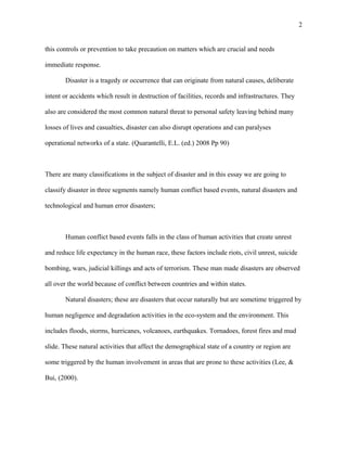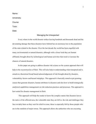 The document discusses disaster risk science as a critical approach for understanding and managing disasters, particularly in Haiti, emphasizing the interplays of human activities and natural events that exacerbate vulnerabilities. It highlights the historical context of repeated disasters in Haiti and critiques the preparedness and response measures that have previously failed to effectively mitigate the impacts. The document advocates for improved infrastructure, public awareness, and disaster management planning to reduce future casualties and enhance recovery efforts.
