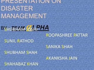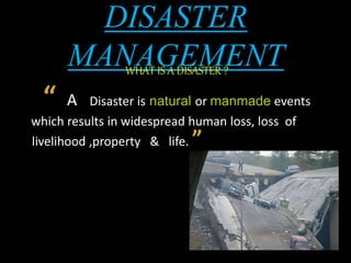 1) The presentation discusses different components of disaster management including preparedness, response, recovery, mitigation, and development. It provides examples of each component.