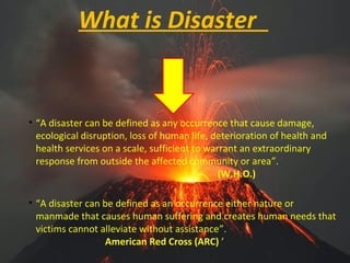 The document discusses disaster management and defines disasters. It notes that disasters can be natural or man-made, and lists some common types of each. The key phases of disaster management are prevention, preparedness, response, and rehabilitation/reconstruction. Major disasters that have impacted India between 1980-2005 are also outlined, including floods, cyclones, earthquakes, and tsunamis. The principles of disaster management focus on minimizing casualties, preventing further harm, rescuing victims, providing first aid and evacuation, medical care, and reconstruction.