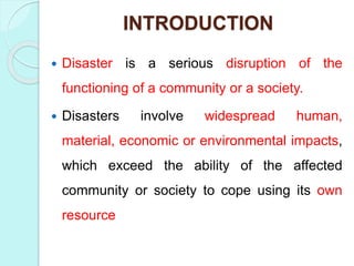 This document discusses advanced disaster management systems. It outlines different types of natural and man-made disasters and weaknesses in current disaster management. It then describes the disaster management cycle and key aspects of the planning and implementation process, including preparedness, mitigation, relief activities, and recovery. New technological developments for disaster detection and response are also presented, along with calls for better education, training, equipment, and funding to improve disaster management.