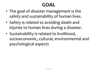 - Principles include that disaster management is a shared responsibility across all levels of government, uses existing day-to-day resources, involves organizations playing roles aligned with their core functions, and recognizes the roles of individuals and non-government agencies.