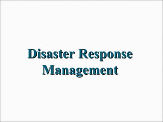The document discusses disaster response management, including defining disasters and hazards, classifying disasters, the phases of a disaster from preparation to recovery, and details of the Incident Command System used to manage response efforts. Key aspects of disaster response outlined are emergency support functions, medical response phases, and the importance of coordination, planning, and establishing a clear command structure to effectively manage response operations.