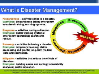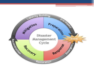 3. The phases of disaster management are discussed as mitigation, preparedness, response, and recovery. Preparedness includes developing disaster plans, identifying resources, and practicing response.