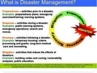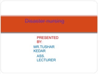 The document discusses disaster nursing, covering the definition of disasters, types of disasters (both natural and man-made), and the principles of disaster management, which includes prevention, preparedness, response, and recovery phases. It outlines the vital role nurses play in disaster scenarios, emphasizing community assessment, disaster planning, and evaluation of disaster response effectiveness. Additionally, it highlights the involvement of international agencies in aiding disaster management efforts.