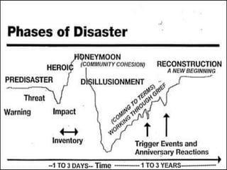 Disaster management involves preparing for, responding to, and recovering from disasters. A disaster is defined as any event that causes damage, loss of life, or deterioration of health beyond the capacity of local communities. Disaster nursing focuses on meeting physical and emotional needs resulting from disasters. Disasters can be natural or man-made, and affect communities in different ways depending on factors like speed of onset and duration. The phases of disaster management include preparedness, response, rehabilitation, and mitigation. Nurses play an important role in all phases through activities like community assessment, triage, disease surveillance, and psychological support.