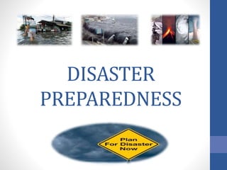This document outlines key aspects of disaster preparedness for hospitals. It defines disaster preparedness and lists common natural hazards in Fiji. The aims of preparedness are to help people avoid threats and ensure those affected receive assistance. Key parts of hospital emergency plans include communications, resources/assets, staff responsibilities, utilities management, patient clinical support, and regular testing/evaluation. The four phases of emergency management are mitigation, preparedness, response and recovery.