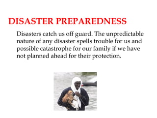 The document provides information on preparing for different types of disasters including fires, thunderstorms, tornadoes, hurricanes, floods, earthquakes, volcanoes, and hazardous materials incidents. It emphasizes the importance of having an emergency plan and disaster kit with essential supplies like water, food, medications, clothing and more. It details steps to take during different disasters like evacuating for fires and hurricanes, going to an interior safe room for tornadoes, and sheltering in place if told to do so. Recovery efforts can last from days to years depending on the scale of the disaster.