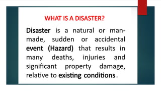 A disaster is a sudden, catastrophic event that causes serious disruption to a community or environment, leading to loss of life, property, and resources. 🧭 Key Points: Disaster = Hazard + Vulnerability A hazard becomes a disaster when people or communities are unable to cope. Types of Disasters: 🌋 Natural: Earthquakes, typhoons, floods, volcanic eruptions, landslides, droughts 🔥 Human-made (Man-made): Fires, chemical spills, war, industrial accidents, pollution Impacts of Disasters: 🔹 Loss of lives 🔹 Damage to homes, infrastructure, and environment 🔹 Economic loss 🔹 Physical and emotional suffering 🧯 Disaster vs. Emergency Emergency Disaster Can be managed with local resources Overwhelms local capacity Small-scale Large-scale and severe Example: minor fire Example: super typhoon