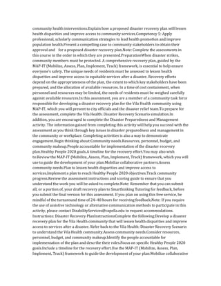 1) Develop a disaster recovery plan for the Vila Health community using the MAP-IT framework to guide development. The plan aims to lessen health disparities and improve access to services after a disaster.