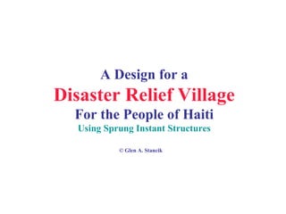 The document proposes a design for a disaster relief village in Haiti using sprung instant structures to provide shelter and community for the 1.2 million people still displaced since the 2010 earthquake. The proposed design aims to quickly provide shelter that is affordable, resistant to natural elements, and addresses both physical and social needs by giving dignity and enabling communities. Key aspects of the design include dormitories, washrooms, and administrative spaces that can be assembled rapidly and expanded over time to house thousands at a relatively low cost while being resistant to hurricanes and earthquakes.