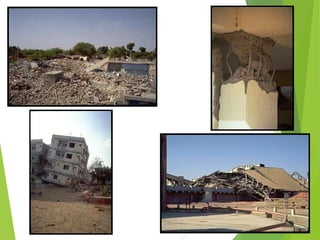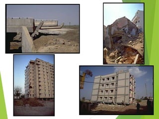 The document discusses the Richter scale for measuring earthquake magnitude and the associated damage levels. It then discusses soil liquefaction, which is when saturated soil loses strength during an earthquake. Finally, it provides recommendations for earthquake-resistant building foundations and structures, including using continuous reinforced concrete footings, connecting column footings, avoiding weak soils, reinforcing walls, adding horizontal reinforcement in walls, tying walls together, adding shear walls, and designing openings and water tanks properly.