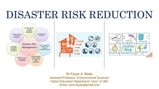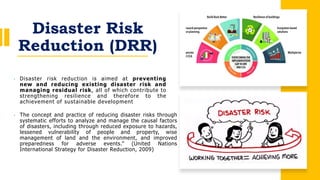 The document discusses disaster risk reduction (DRR) and provides definitions, components, strategies, and challenges related to DRR. It defines DRR as aimed at preventing new and reducing existing disaster risk to strengthen resilience. The key components of DRR discussed are mitigation, preparation, response, and recovery. Challenges to addressing DRR include lack of political commitment, resource constraints, and ineffective disaster information systems. International frameworks like the Hyogo Framework and Sendai Framework provide guidance on DRR policy and priorities.