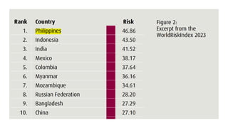 The document outlines the importance of disaster risk reduction and management (DRRM) in basic education, emphasizing the need for schools to formulate plans for disaster preparedness and climate change adaptation. It details concepts such as hazards, vulnerability, capacity, and resilience, and introduces the Comprehensive School Safety Framework aimed at protecting learners and ensuring educational continuity during disasters. Additionally, it provides strategies for integrating DRRM into school curricula and establishing organizational support structures for effective implementation.