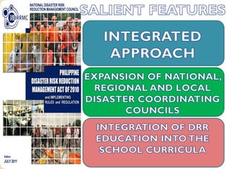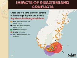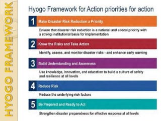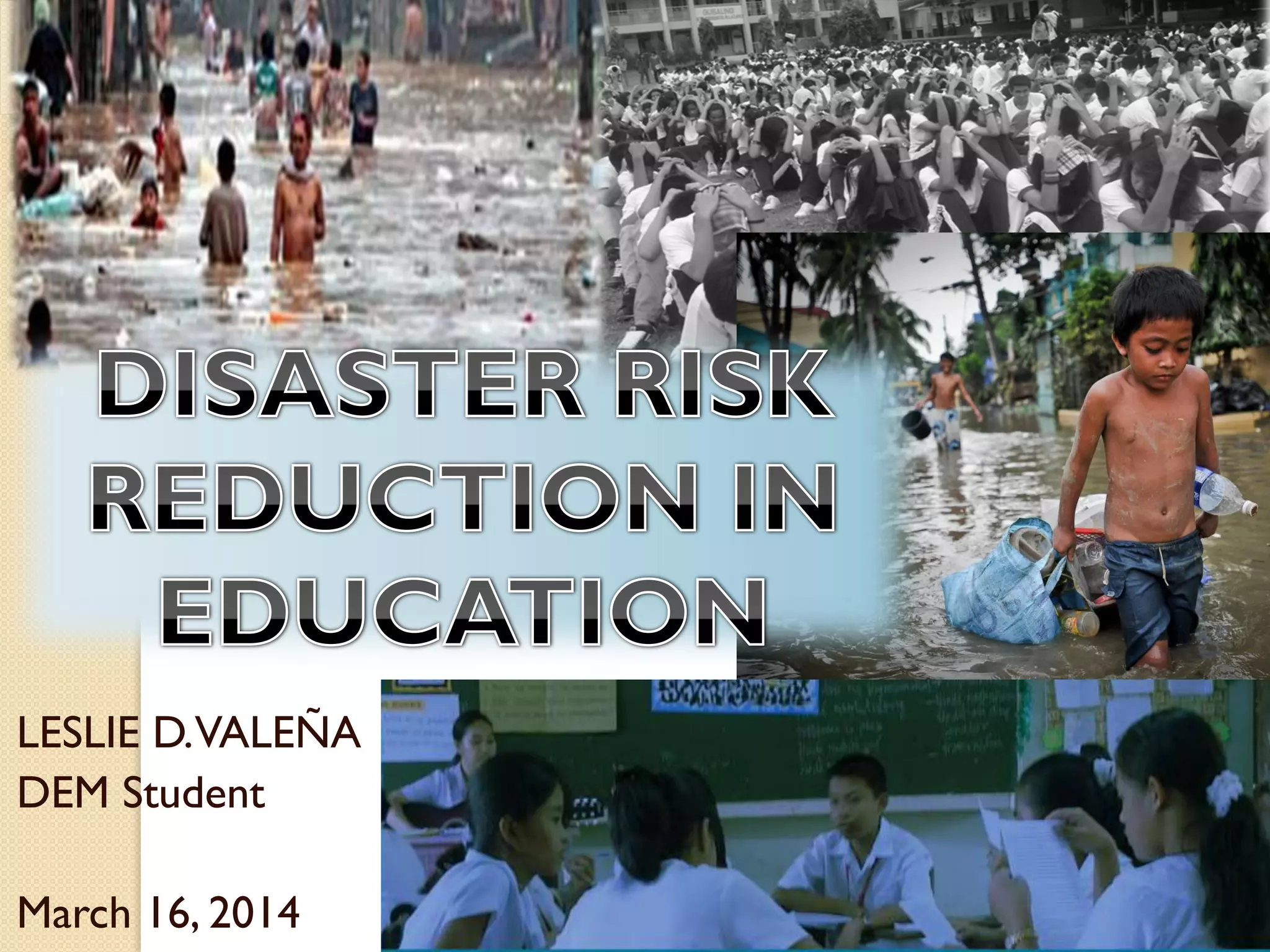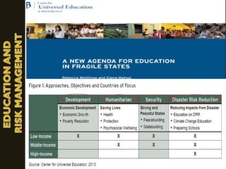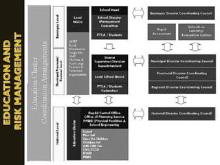 This document outlines a presentation on disaster risk reduction in education. It discusses mandates for DRR, impacts of conflicts and disasters on learners and teachers, and issues in education and risk management. Specific impacts include closure of schools as shelters, damage to equipment and records, access issues, lack of teachers and materials, and physical and emotional trauma. The document also outlines strategies for DRR in education such as ensuring school safety, enhancing emergency preparedness knowledge, and teaching children preparedness.