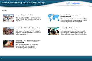 The document provides an overview of a course on disaster volunteering. It covers 5 lessons: 1) an introduction, 2) when disasters strike, 3) the disaster response community, 4) disaster response organizations, and 5) a call to action. The lessons describe common disasters and their impacts, how the community responds collaboratively, key response organizations like the Red Cross, and steps to become a volunteer. The goal is to educate about disaster relief efforts and engage more volunteers.