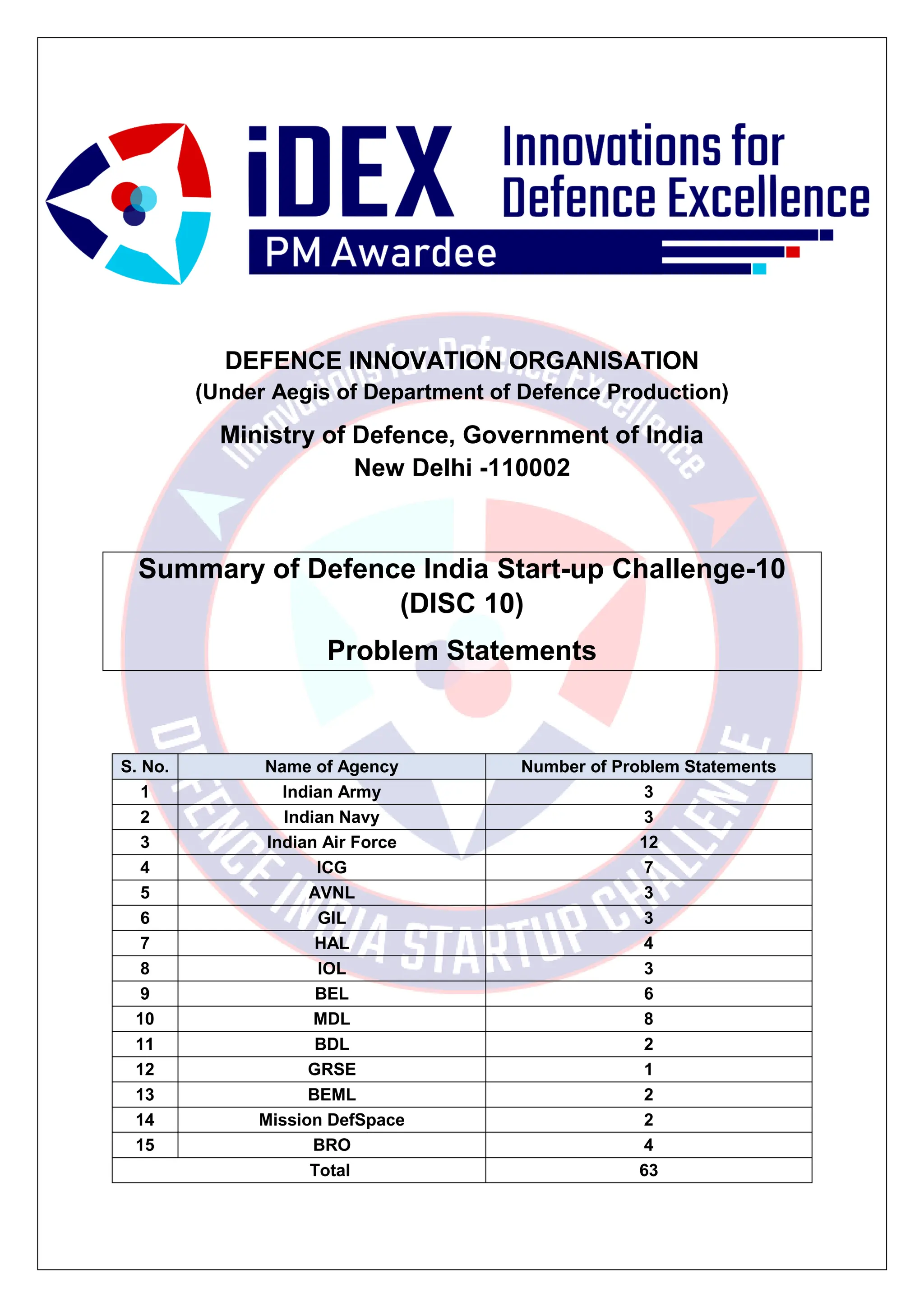 The document summarizes 63 problem statements from various organizations in the Indian defence sector for the Defence India Start-up Challenge 10 (DISC 10). The problem statements are grouped by the issuing organization and cover domains including automatic topographic feature extraction, combat parachute safety devices, digital cockpit systems, naval engineering tools, underwater targeting, naval intelligence networks, hypoxic training equipment, radar domes, weather prediction, and colored smoke for aerobatic demonstrations. The goal of DISC 10 is to foster innovation by startups to address technical challenges faced by the defence organizations.