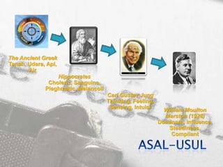 Dokumen tersebut membahas tentang teori kepribadian DISC yang dikembangkan oleh William Moulton Marston pada tahun 1928. Teori ini membagi 4 tipe kepribadian dasar manusia menurut dominansi, pengaruh, kestabilan, dan kepatuhan. DISC digunakan untuk berbagai tujuan seperti rekrutmen, penilaian, penempatan ulang, pembentukan tim, hingga pengembangan karir.
