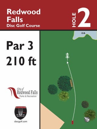 The document describes 8 holes of the Redwood Falls Disc Golf Course. It provides the hole number, distance, par, and direction for each hole. The distances range from 180 to 305 feet and the pars are either 2, 3, or 4. It also notes out of bounds areas and mandatory areas for some of the holes.