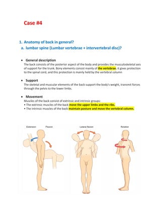 The lumbar spine consists of five lumbar vertebrae separated by intervertebral discs. A disc herniation occurs when the nucleus pulposus of an intervertebral disc bulges out through a tear in the annulus fibrosus. Common causes of lower back pain include muscular problems, herniated discs, degenerative disc disease, and spondylolisthesis. A herniated disc is typically diagnosed through MRI imaging and can be managed initially through rest, physical therapy, and pain medications. Epidural injections or surgery may be required if conservative treatments do not provide relief from nerve compression and pain. Surgical options include discectomy, laminotomy, spinal fusion, and artificial disc replacement.