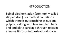 This document provides information on spinal disc herniation, including: