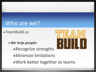 This document summarizes a workshop about personality types using the DiSC model. It discusses the four DiSC styles (Dominance, Influence, Steadiness, Conscientiousness), their characteristics, strengths and limitations. The workshop focuses on reviewing DISC reports, understanding different personality types, and strategizing how to engage effectively with each type. Participants discuss their own DiSC styles and complete exercises engaging with different personality types. The goal is to help people recognize strengths, minimize limitations, and work better together as teams by understanding personality types.