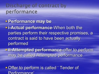 The document discusses various aspects of discharge and performance of contracts such as actual performance, attempted performance, tender of performance, parties that can demand performance like promisees and third parties, modes of discharge like agreement between parties, operation of law, and impossibility of performance. It also discusses breach of contracts, types of damages for breach, and specific relief.