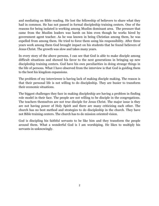 The document summarizes interviews with two seminary students about their discipleship journeys. One respondent became a Christian during a revival movement where believers boldly shared their faith. They studied together in groups of three or more and were accountable to pray, study the Bible, and evangelize. The second person felt a burning desire to follow Jesus but faced isolation working in a Muslim area, though he eventually led some students to faith. Both experienced God working during difficult times and establishing new discipleship centers. The challenges to effective discipleship included a lack of role models, unwillingness of people to be disciples, and teachers not being true disciples themselves due to a lack of Holy Spirit's power.