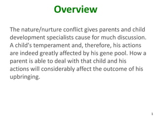 The document discusses various aspects of child development and parenting, emphasizing the importance of meeting a child's needs for trust and independence from infancy through adolescence. It outlines parental techniques to foster positive relationships and encourage emotional and cognitive growth, stressing that reasonable responsiveness and consistent care are crucial at every developmental stage. Additionally, it emphasizes the need for parents to be informed and adaptable in their parenting approaches to support their child's growth and self-esteem.