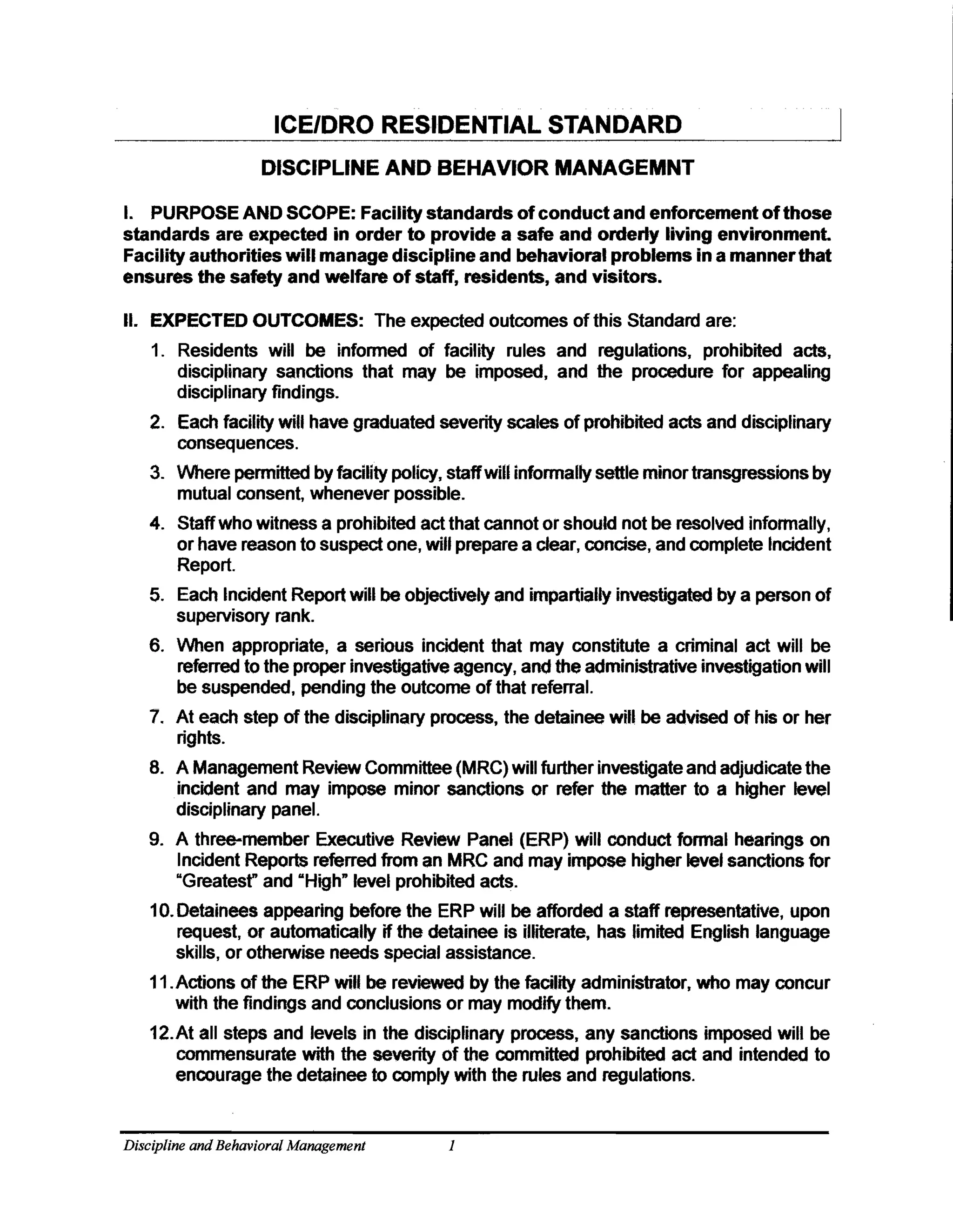 1. The document outlines disciplinary and behavioral management policies and procedures for a residential facility holding ICE detainees who are part of family units. It establishes a progressive disciplinary process with multiple levels of review and appeals.