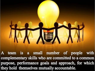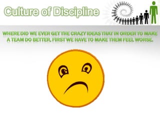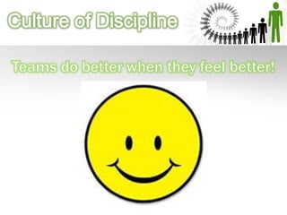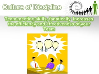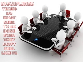 The document outlines the purposes and principles of discipline in the workplace, emphasizing the importance of clear communication about performance expectations and motivational strategies to improve employee morale. It describes the structure and dynamics of discipline teams, including their roles and responsibilities compared to single leader units, and highlights elements that make teams function effectively. Key concepts include mutual accountability, the significance of collective work, and the need for a disciplined organizational culture that aligns with the company's goals.