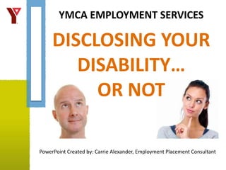 The workshop focuses on the benefits and concerns of disclosing a disability in the workplace, emphasizing the importance of making an informed choice and understanding key terms like disclosure and accommodation. It outlines the advantages, such as receiving support and legal protection, and disadvantages, like potential discrimination and self-image issues. The document also provides guidance on how to prepare for disclosure, including creating a personal script and selecting appropriate timing and audience.